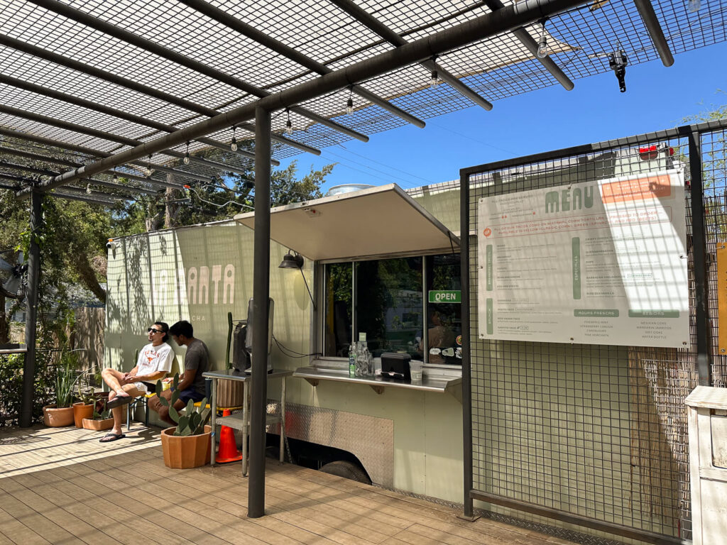 At The Long Goodbye is food truck La Santa Barbacha, known for its barbacoa. It’s another family-owned business with passed-down recipes and traditions. You might have heard they earned a Bib Gourmand honor from the Michelin Guide for the last two years. Here we enjoyed a few noteworthy things: the strawberry horchata, melon agua fresca, and quesabarbacha – a quesadilla with barbacoa, cheese, cilantro, and onions. So good!