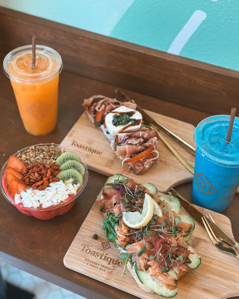 The most colorful breakfast at Toastique – healthier AND delicious! This location at the Domain opened in October, and you can get gourmet toast, smoothie bowls, cold-pressed juices, and smoothies. It’s a counter-service spot, so it’s good for a quick breakfast. On our table: